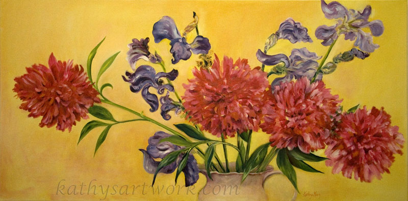 Red Peonies & Purple Iriss' on Yellow